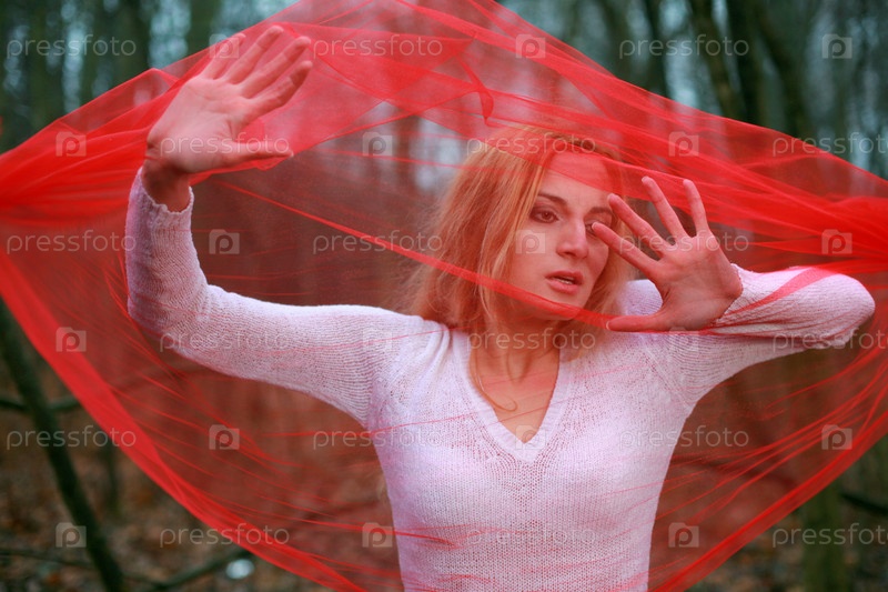 Красивая женщина с прозрачным красным платком в лесу