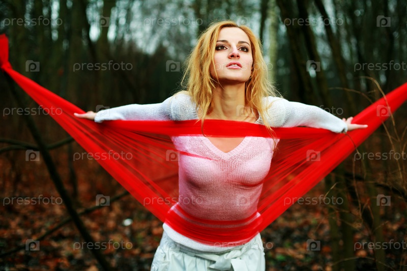 Девушка с красным платком в лесу