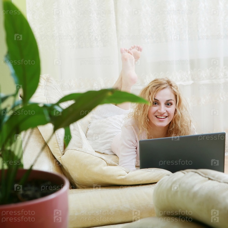 Девушка с ноутбуком на диване