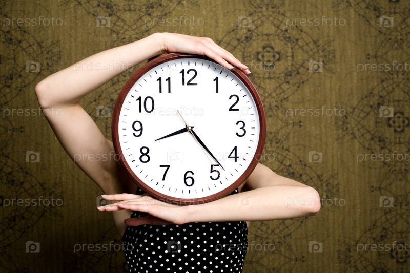 Большие круглые часы в руках девушки на фон старых обоев