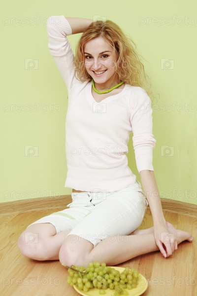 Веселая девушка сидит на полу с тарелкой винограда