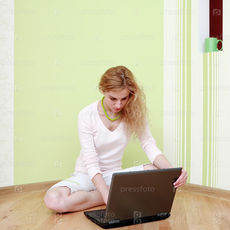 Девушка сидит на полу перед ноутбуком