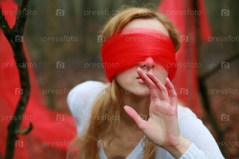 Молодая девушка с красной повязкой на глазах в лесу