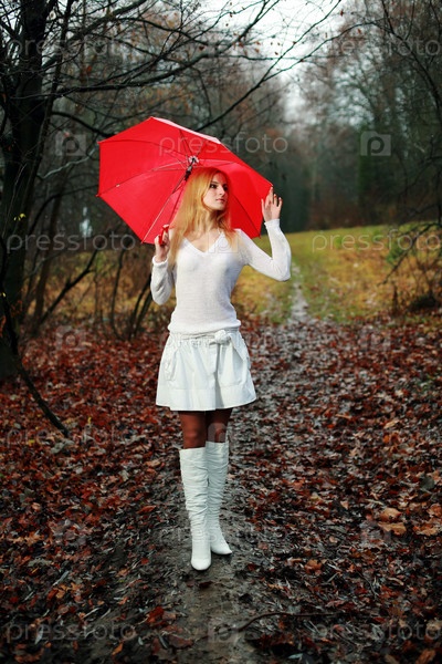 Женщина с красным зонтом в парке