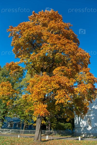 Клен с желтыми листьями в городском парке