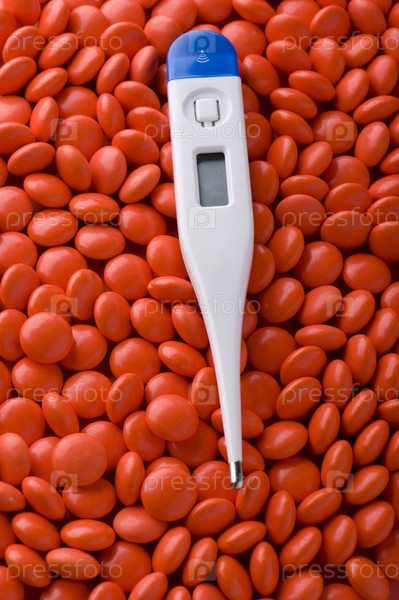 Объект на красном - Таблетки и термометр вблизи красного