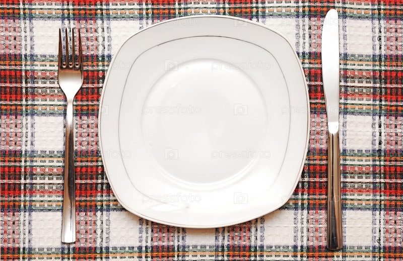 Белая пустая тарелка с вилкой и ножом на клетчатой скатерти
