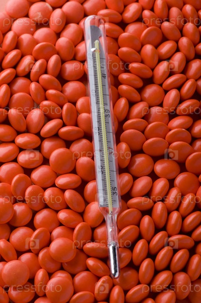 Объект на красном - Таблетки и термометр вблизи красного