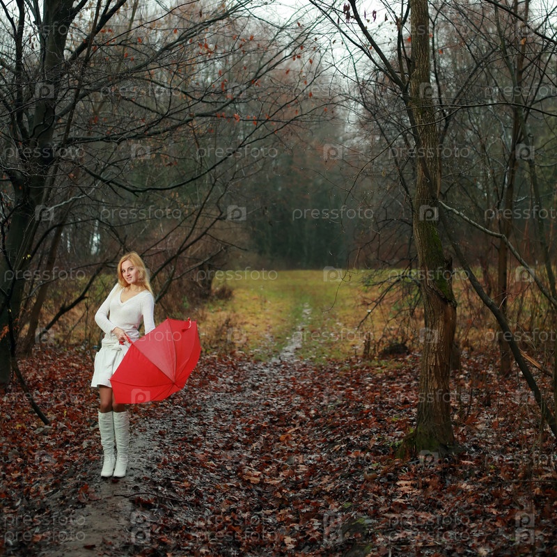 Красивая женщина с красным зонтом в осеннем парке