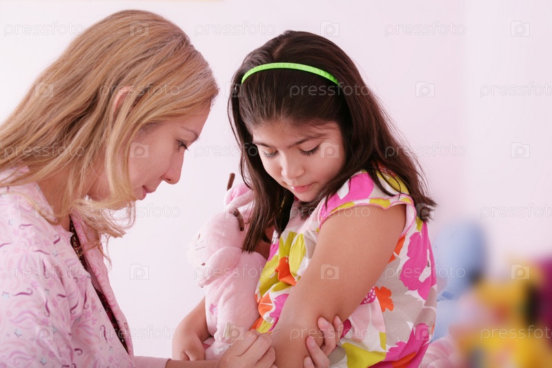 Врач делает укол в руку маленькой девочки. Фокус на девочке