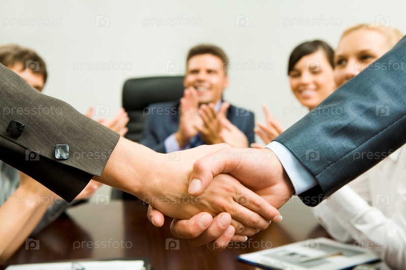 Фото успешных деловых партнеров, рукопожатые после поразительной сделки с аплодисментами людей на заднем плане