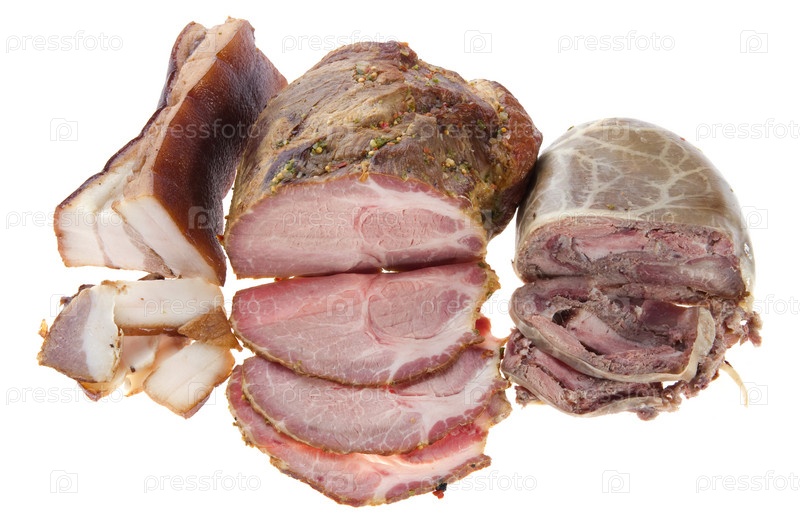 Сало, ветчина и колбаса с печенью на белом фоне