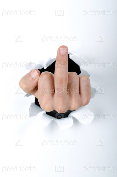 Рука показывает неприличный жест через отверстие в бумаге