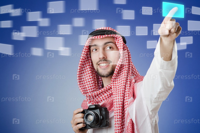 Молодой араб с фотоаппаратом нажимает на сенсорную копку