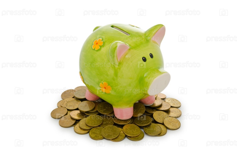 Копилка и монеты на белом фоне