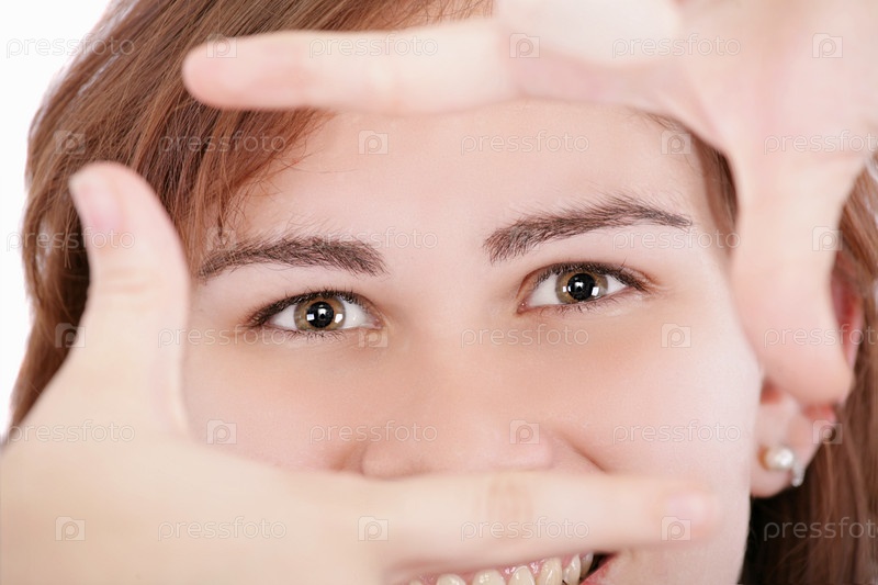 Женщина смотрит через рамку из пальцев