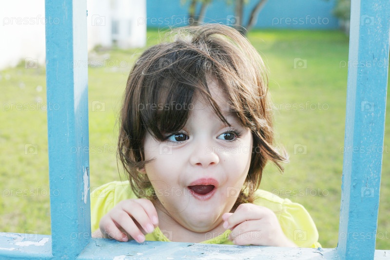 Возбужденная маленькая девочка играет во дворе