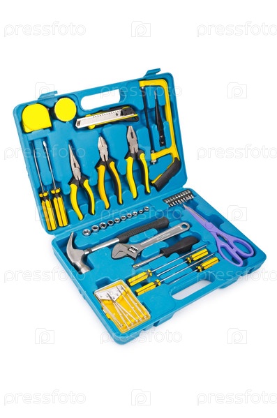 Кейс со множеством инструментов, изолированный на белом фон