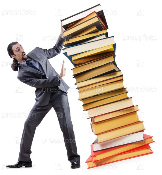 Предприниматель с книгами на белом фоне