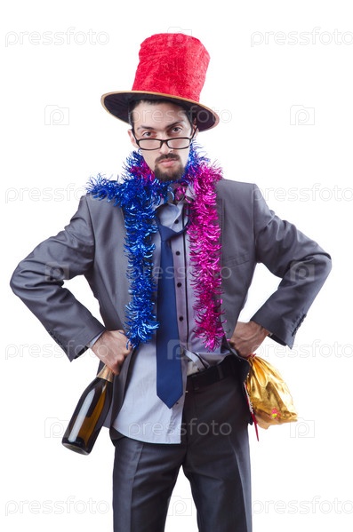 Бизнесмен в новогодней шляпе с шампанским в руке