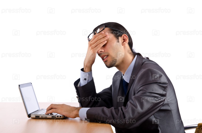 Уставший бизнесмен, сидящий с ноутбуком за столом