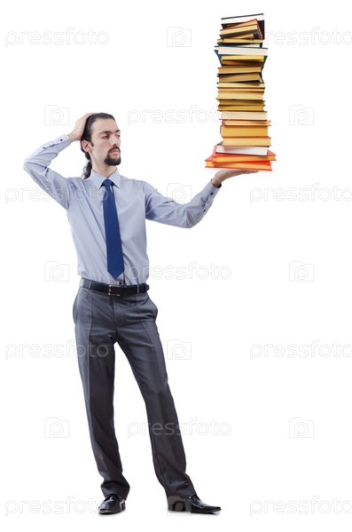 Предприниматель с книгами на белом фоне