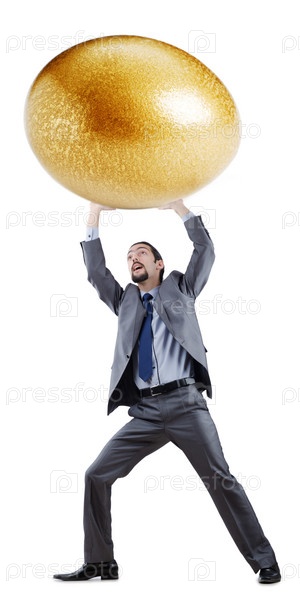 Мужчина с золотым яйцом. Изолировано на белом фоне