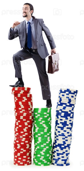 Бизнесмен поднимается по стопкам фишек