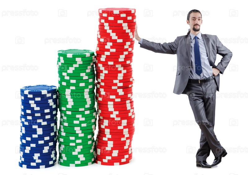 Бизнесмен с фишками казино на белом фоне