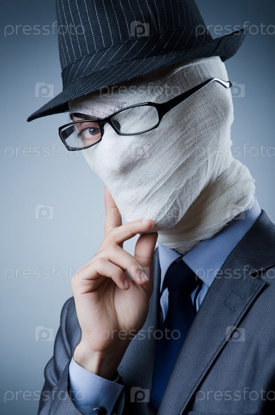 Деловой мужчина с перебинтованным лицом на сером фоне