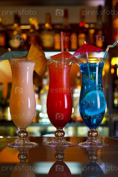 Коктейли голубая лагуна, пина колада и восход на барной стойке