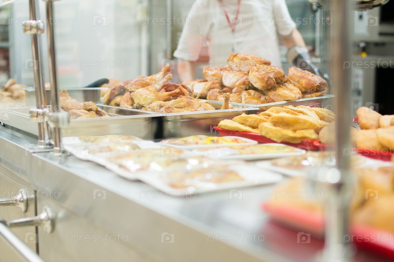 Жареные куриные крылышки и бедрышки на столе в супермаркете
