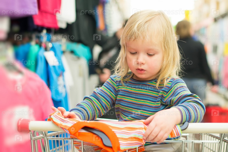 Маленький ребенок в корзине выбирает одежду в супермаркете
