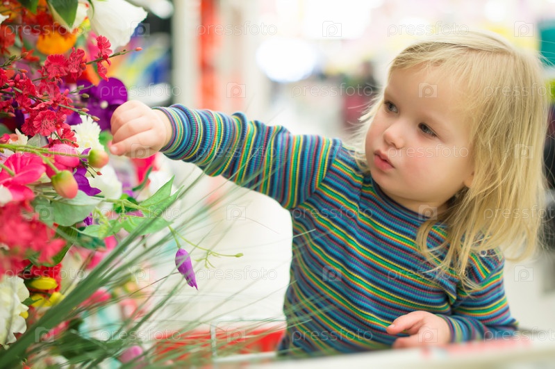 Прелестный ребенок в цветочном отделе в супермаркете