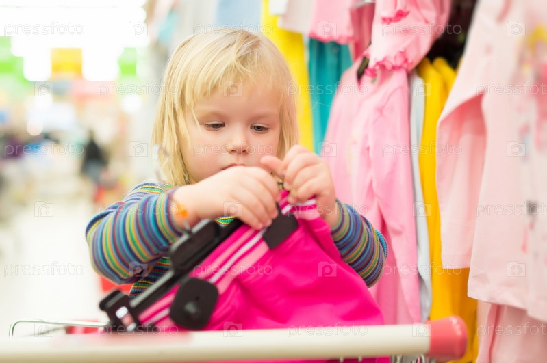 Девочка выбирает одежду в супермаркете