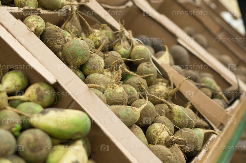 Зеленая редька в коробках в супермаркете