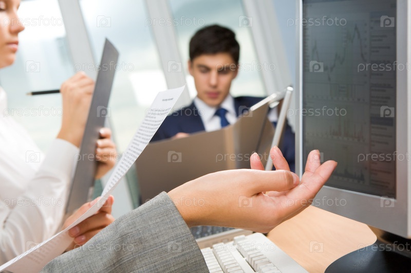 Близкий план женской руки с помощью бумаги на фоне секретаря и рабочего