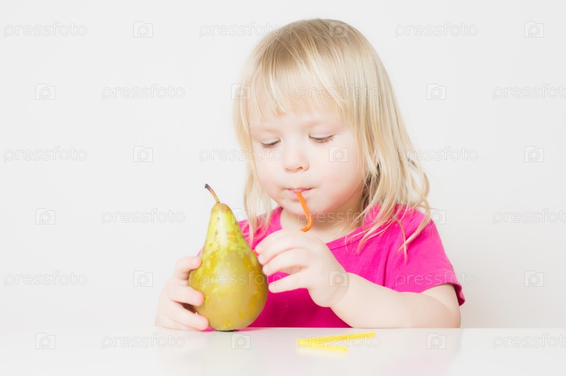 Девочка пьет сок из груши