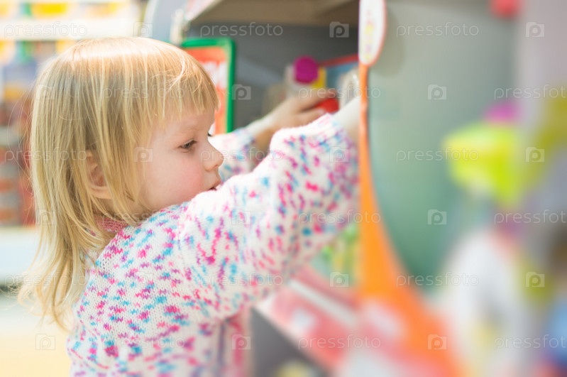 Девочка рассматривает игрушки в супермаркете