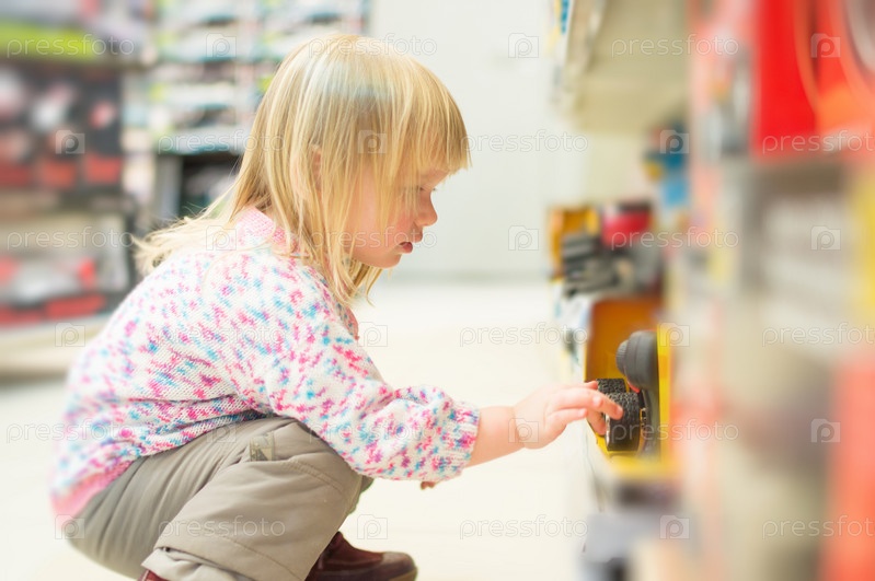 Девочка рассматривает игрушки в супермаркете