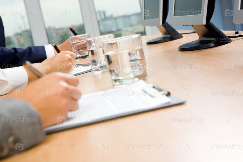 Ряд человеческих рук, держащих перо и делающих заметки со стаканом воды и мониторами рядом