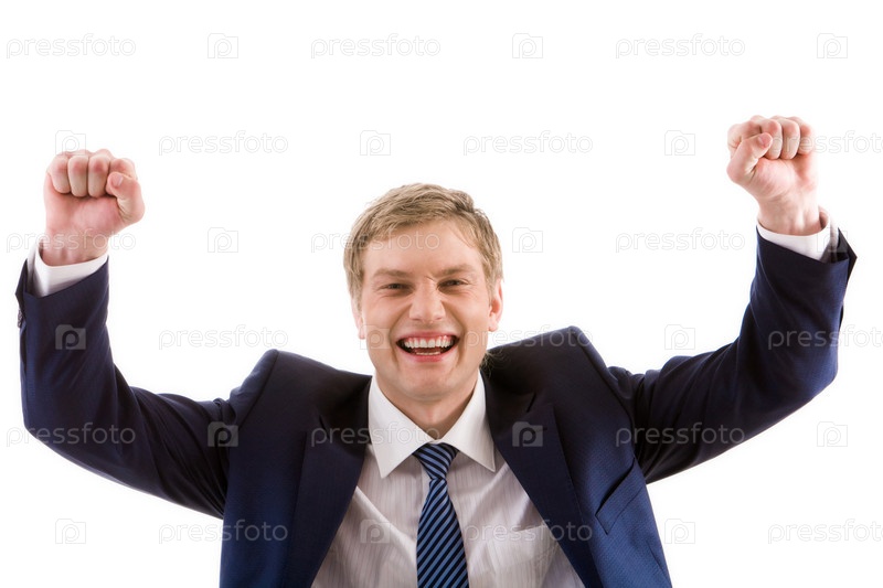 Портрет счастливого победителя, показывающего свое счастье, держа руки поднятыми