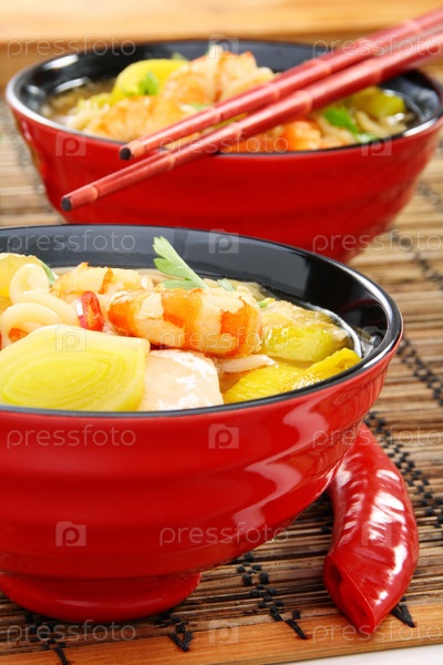 Китайский рыбный суп с креветками в красной тарелке