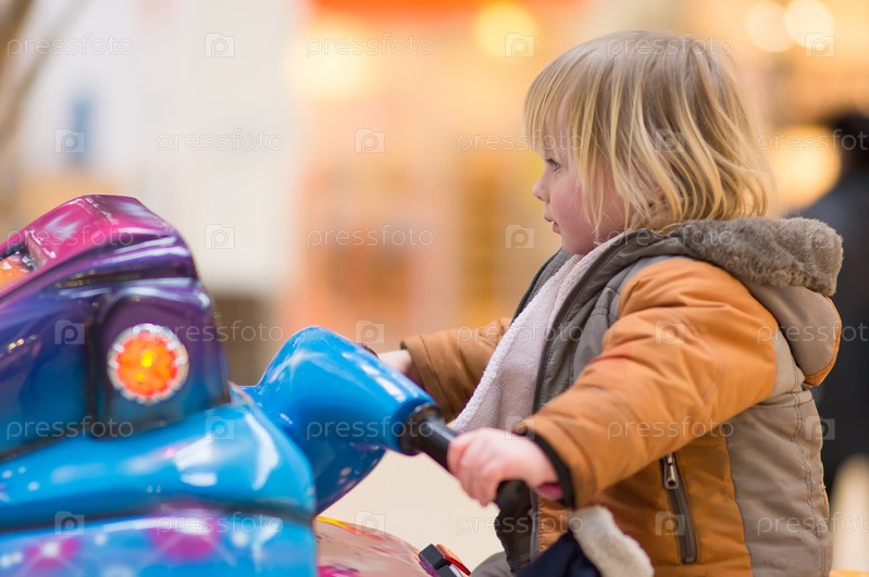 Девочка ездит на игрушечном мотоцикле