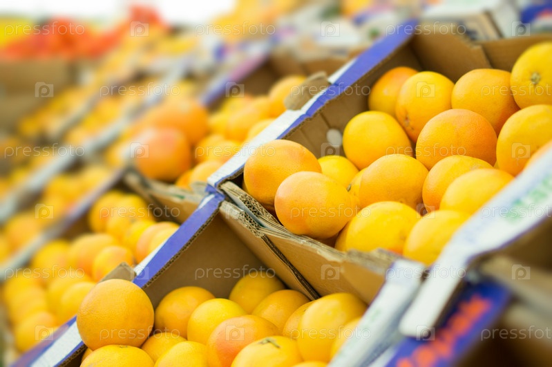 Апельсины в коробках в супермаркете