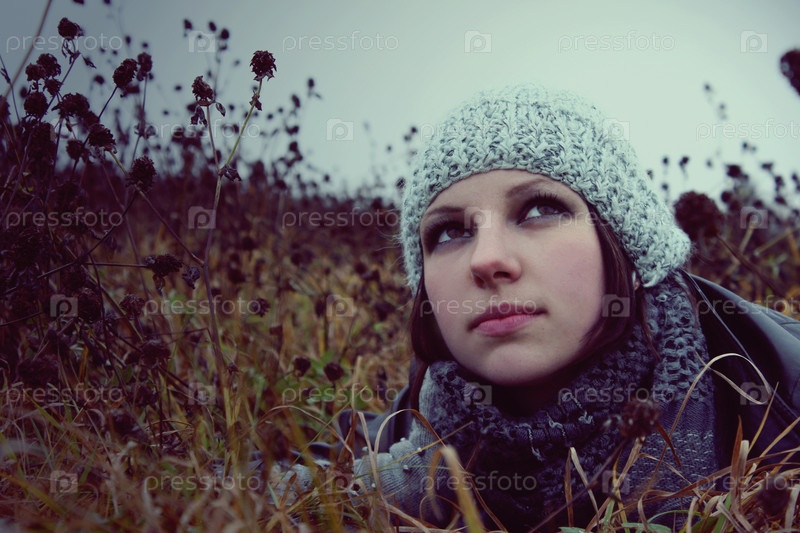 Портрет девушки на лугу в осенней одежде