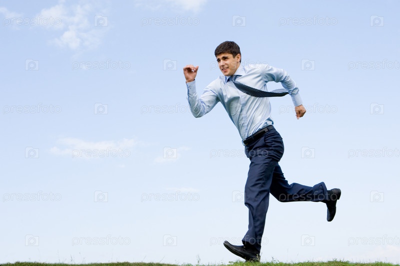 Красивый бизнесмен бежит по траве с голубым небом на заднем плане