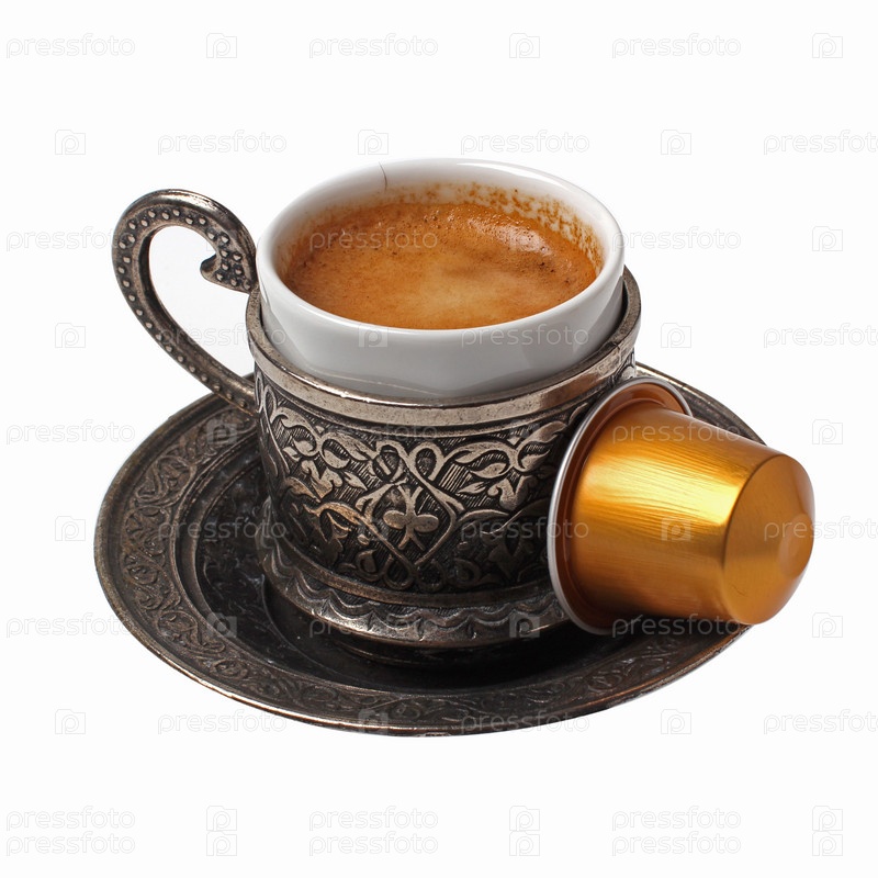 Серебряная чашка кофе и капсула, изолировано на белом фоне