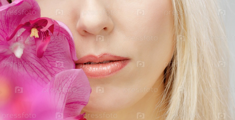 Красивое женское лицо на близком расстоянии, окруженное цветами