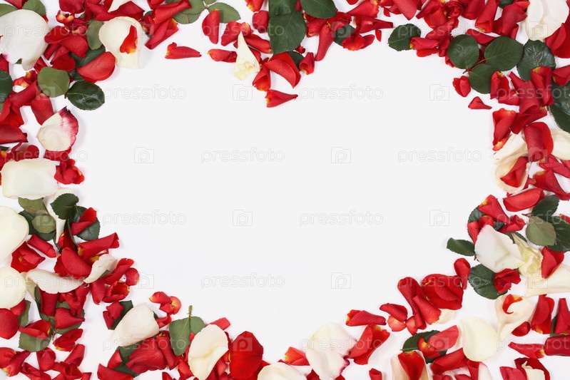 Сердце из красных и белых лепестков роз на белом фоне